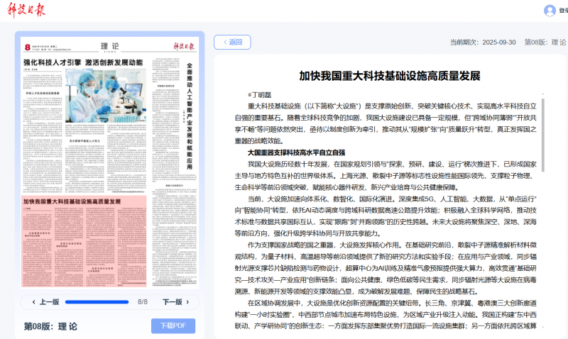 作为支撑国家战略的国之重器,大设施发挥核心作用。在基础研究前沿,散裂中子源精准解析材料微观结构,为量子材料、高温超导等前沿领域提供了新的研究方法和实验手段;在应用与产业领域,同步辐射光源支撑芯片缺陷检测与药物设计,超算中心为AI训练及精准气象预报提供强大算力,高效贯通“基础研究—技术攻关—产业应用”创新链条;面向公共健康、绿色低碳等民生需求,同步辐射光源等大设施在病毒溯源、新能源开发等领域的支撑效能凸显,成为破解发展难题、保障民生的战略基石。