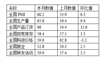 新兴产业的快速发展是中国获得更多主动权的重要抓手,近几个月数据中的结构剧烈变化,期待中国新兴产业迅速调整以适应新的全球产业链。企业主动适应发展要求,在产品结构和技术含量上更多投入,研发活动本月环比回升2.5至59.9,但新品投产大幅回升18.9至66.4——投研环比差值创出历史最高,企业研发力量受限,集中力量快速投新而适应市场。本月贷款难度回落1.4至56.4,同比回落7.1,位于年中低阈值,凸现去杠杆政策放宽效果。预计下月PMI有所回落但保持稳定。”